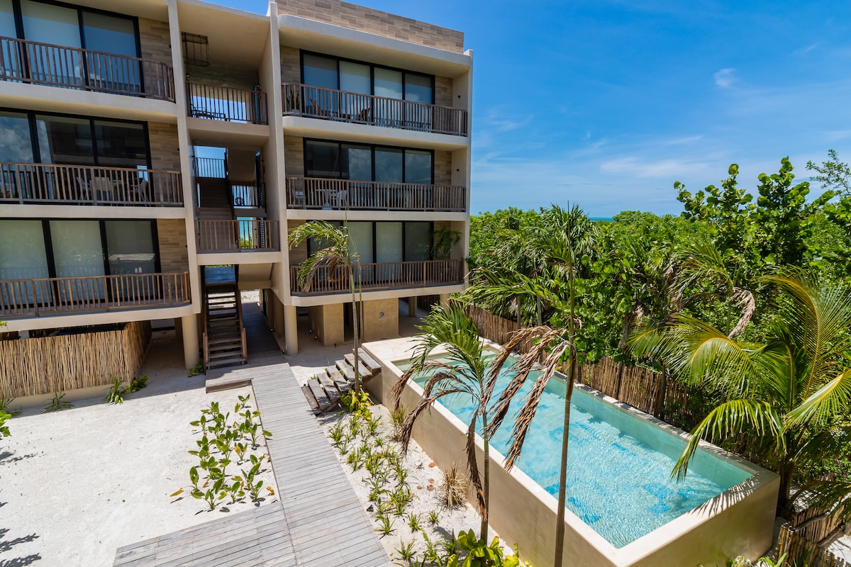 Experience the best of Holbox from this independent beachfront room designed for comfort, privacy, and style. Located right across from the public beach and just a short walk from the island's center. The room features a bohemian style polished-concrete design that blends natural textures with a relaxed island vibe. Enjoy your private balcony with ocean view, after a sunny day at the beach. Stay where the best of Holbox comes together: ocean views, comfort, and authentic island charm 🌴🌞