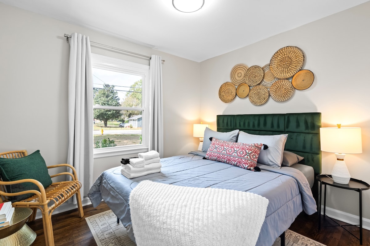 रेट्रो रिट्रीट में समय पर वापस जाएँ - आधुनिक आराम के साथ एक स्टाइलिश 2BR होम ब्लेंडिंग विंटेज डिज़ाइन। विक्ट्रोला पर विनाइल घुमाएँ, 4 - सीज़न वाले पोर्च में कॉफ़ी पीएँ और विंटेज - स्टाइल फ़्रिज और माइक्रोवेव के साथ रेट्रो थीम वाले लेकिन आधुनिक किचन में पकाएँ। किंग बेड, बेहद तेज़ वाई - फ़ाई और स्मार्ट टीवी के साथ शहर से मिनट की दूरी पर। बाहर, विशालकाय बीनबैग कुर्सियों पर या बाड़ वाले यार्ड के भीतर आग के गड्ढे के पास आराम करें। यह जोड़ों, छोटे समूहों और लंबे समय तक घूमने - फिरने की जगहों के लिए बिल्कुल सही है।