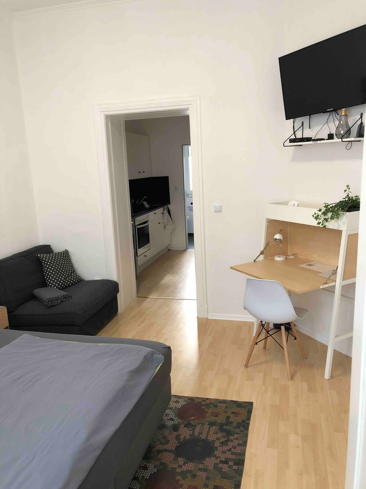 पुरानी बिल्डिंग में 1 कमरों वाला खूबसूरत अपार्टमेंट (ग्राउंड फ़्लोर) है, जिसमें अलग किचन है और खिड़की वाला चमकीला आधुनिक शॉवर रूम है। कमरे में एक डबल बेड (1.80 मीटर), टीवी और मुफ़्त वाई - फ़ाई है। तौलिए हर हफ़्ते बदले जाते हैं, चादरें 14 दिन बदल दी जाती हैं। आँगन में बैठने की जगह है (धूम्रपान करने वालों के लिए)। आसपास की सड़कों पर मुफ़्त सार्वजनिक पार्किंग की सुविधा उपलब्ध है। अच्छे सार्वजनिक परिवहन कनेक्शन (बसें, Neuss रेलवे स्टेशन से 2.5 किमी), आस - पास की खरीदारी और लॉन्ड्रोमैट।