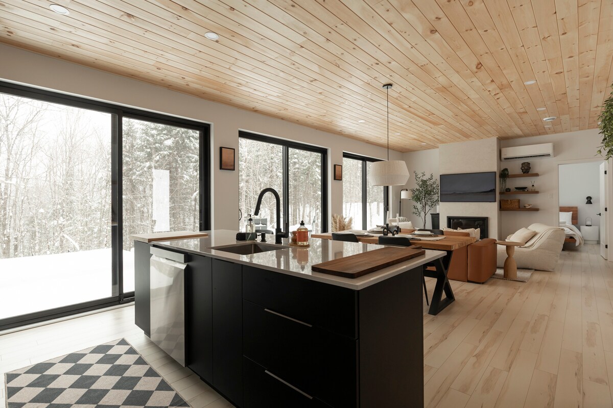 2023 में बनाया गया आकर्षक समकालीन 2 बेडरूम का केबिन, जो ला कॉन्सेप्शन क्षेत्र के केंद्र में स्थित है, जो मोंट ट्रेम्बलांट विलेज, ट्रेम्बलांट स्की हिल और कई लंबी पैदल यात्रा साइटों के लिए बस 15 मिनट की दूरी पर है। कम से कम शैली के साथ एक गर्म आरामदायक केबिन में रहने का आनंद लें, जो भरपूर खिड़कियों के साथ प्रकृति से घिरा हुआ है। वीकएंड की छुट्टियाँ बिताने या घर से काम करने के विकल्प के लिए बिल्कुल सही केबिन पूरी तरह से आधुनिक फ़र्नीचर, बिल्कुल नए उपकरण, आउटडोर हॉट टब और स्कैंडिनेवियाई गैस फ़ायरप्लेस से सुसज्जित है।
