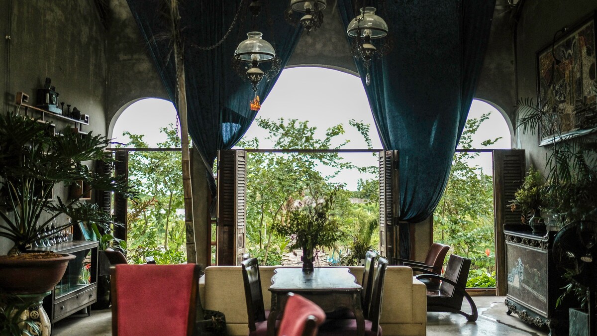 Tuberose is the most feminine room in our home. You’ll find her softness in the curved frame of the mirror, the gentle hue of the curtains, the graceful lines of the washbasin stand. The view opens to a calm river, and beyond it, endless rice fields that change shades with the sky. It has a king-size bed and spans 32 sqm, with room for an extra bed if needed.