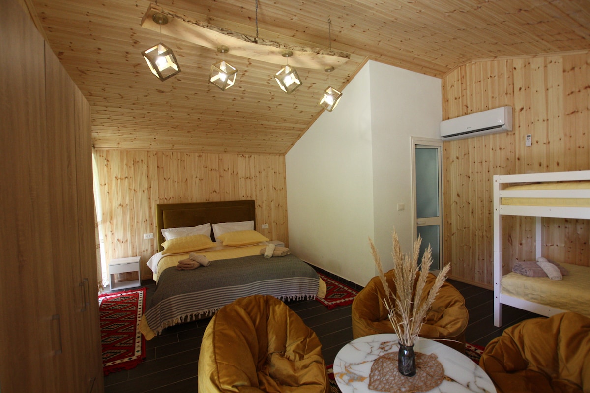पहाड़ों से घिरी नदी के बगल में मनोरम जगह, ताज़ा हवा, परिचित आरामदायक जगह। राष्ट्रीय सड़क के किनारे। 8 अलग - अलग केबिन, 3 डबल और 5 फ़ैमिली रूम।