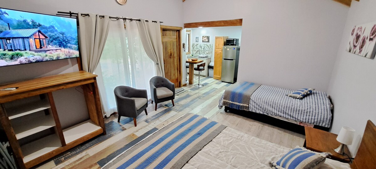 Caba├▒a de 1 ambiente + ba├▒o, ideal para dos personas que buscan un lugar c├│modo, acogedor y con todo lo necesario para una linda estad├нa. A 1800 metros de la playa y del pueblo (20 min. caminando y 5 en veh├нculo). Estacionamiento, tv, wifi, agua caliente, cocina equipada, calefacci├│n. Desde Lican Ray puedes visitar lugares tur├нsticos c├│mo Huilo Huilo, termas, Pucon , Co├▒aripe, Panguipulli, actividades acu├бticas. Ver foto 14 para claridad de acceso y distancias NO est├б frente al lago.