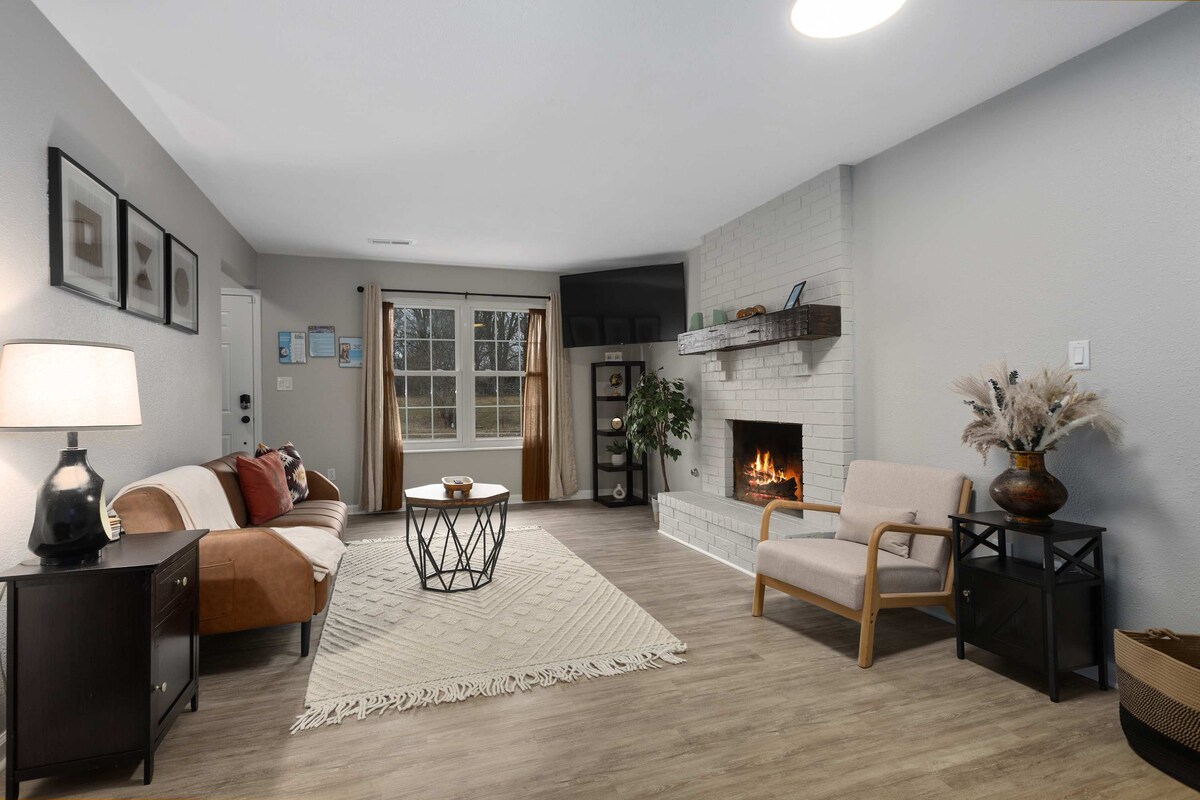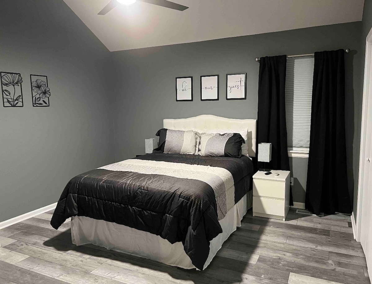 2 तालाबों और रोलिंग चरागाह के साथ 18 एकड़ में ओक ग्रोव में I -70 फ्रंटेज में स्थित इस 600 वर्ग फुट के पूरी तरह से सुसज्जित अतिथि अपार्टमेंट में शांति से सोएं। एक बजरी ड्राइव उस संपत्ति की ओर ले जाती है जहाँ आपके पास एक कंक्रीट पार्किंग की जगह होगी और अपार्टमेंट के सामने के दरवाजे तक एक बिना सीढ़ियों वाला, पैवस्टोन पैदल मार्ग होगा। अपने आराम को पूरा करने के लिए कमरे के गहरे रंग के शेड और अलग - अलग तकियों वाले बेडरूम में क्वीन साइज़ के Tuft n Needle गद्दे पर आराम करें। पूरी तरह से सुसज्जित किचन, लॉन्ड्री रूम, 2 स्मार्ट टीवी।
