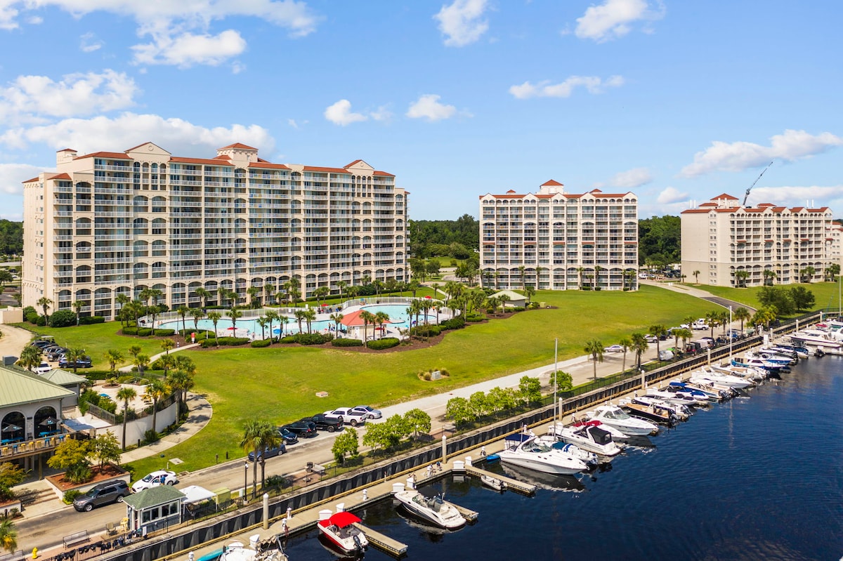 यह शानदार कोंडो "घर से दूर हमारा घर" है जिसे हाल ही में अपडेट किया गया है और पेशेवर रूप से सजाया गया है, यह विशाल (1800 वर्ग फ़ुट) बड़ा 2 बेडरूम, 2 बाथ कॉन्डो में 2 निजी बालकनी से इंटरकोस्टल वॉटरवे और यॉट क्लब के शानदार दृश्य हैं! 4 सिग्नेचर गोल्फ़ कोर्स, रिसॉर्ट - स्टाइल पूल और हॉट टब (SC में सबसे बड़ा), मनोरंजन और खरीदारी के साथ, यह हाई - एंड रत्न दोस्तों और परिवार के इकट्ठा होने के लिए बिल्कुल सही है, सोता है 8 अपनी अगली छुट्टी के लिए यह अद्भुत कोंडो चुनें! W/फ़ायरप्लेस