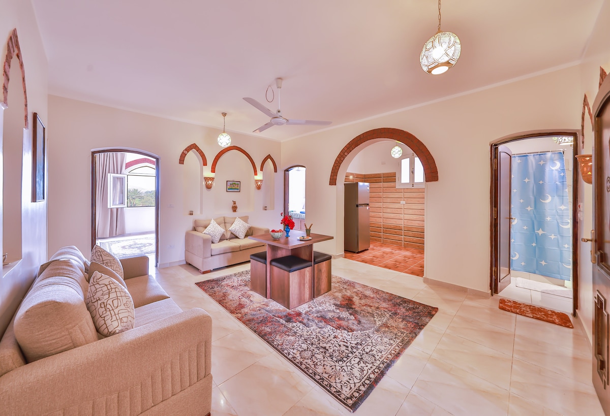 दो मंजिला यह रमणीय स्थान आंतरिक सीढ़ियों, दूसरी मंजिल पर एक विशाल गुंबदनुमा शयनकक्ष, शानदार पर्वतीय दृश्यों से सुसज्जित एक विशाल निजी छत की बालकनी और ठीक सामने रानियों की घाटी के साथ स्थित है। यह एक अत्यंत शांत स्थान है जो पारंपरिक कृषिभूमि के बीच बसा है, लेकिन निकटतम मंदिर मेदिनात हाबू से केवल 7 मिनट की पैदल दूरी पर है, इसलिए मंदिरों के दर्शन के व्यस्त दिन के बाद आप लक्सर के शांत और मनमोहक वातावरण का आनंद ले सकते हैं।बस रहने की जगह।