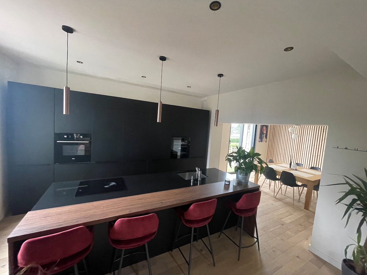 सीढ़ियों , स्विमिंग पूल, टेरेस एपेरिटिफ़ क्षेत्र और भोजन, बारबेक्यू, प्लानचा, डबल बेड वाले 4 बेडरूम, 1 बाथरूम, 2 शॉवर रूम, ब्यूजोलिस और सोफ़ा बेड/टीवी के शानदार दृश्यों के साथ मेज़ानाइन, काँच की खिड़की के साथ 50 m2 का एक बड़ा लिविंग रूम, छत तक पहुँचने वाला एक द्वीप रसोईघर, सोने के साथ एक कार्यालय की जगह। एक गेट के साथ सुंदर घिरा हुआ जंगल वाला बाहरी हिस्सा। स्पा , पेटेंक कोर्ट, बास्केटबॉल बास्केट, 2 कार शेल्टर