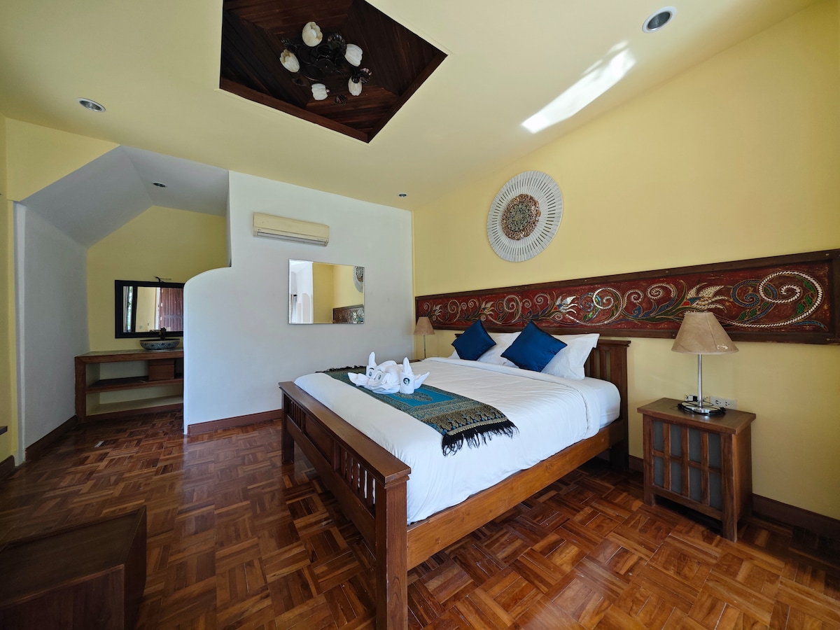 Enjoy your own private villa surrounded by gardens and mountain views. Take a stroll along the paths, relax by the lake, or hang out on the rooftop terrace and soak in the scenery. With your own bedroom, living area, and private bathroom, it’s the perfect spot to unwind and enjoy the calm of nature — all just a short drive from Pai town.