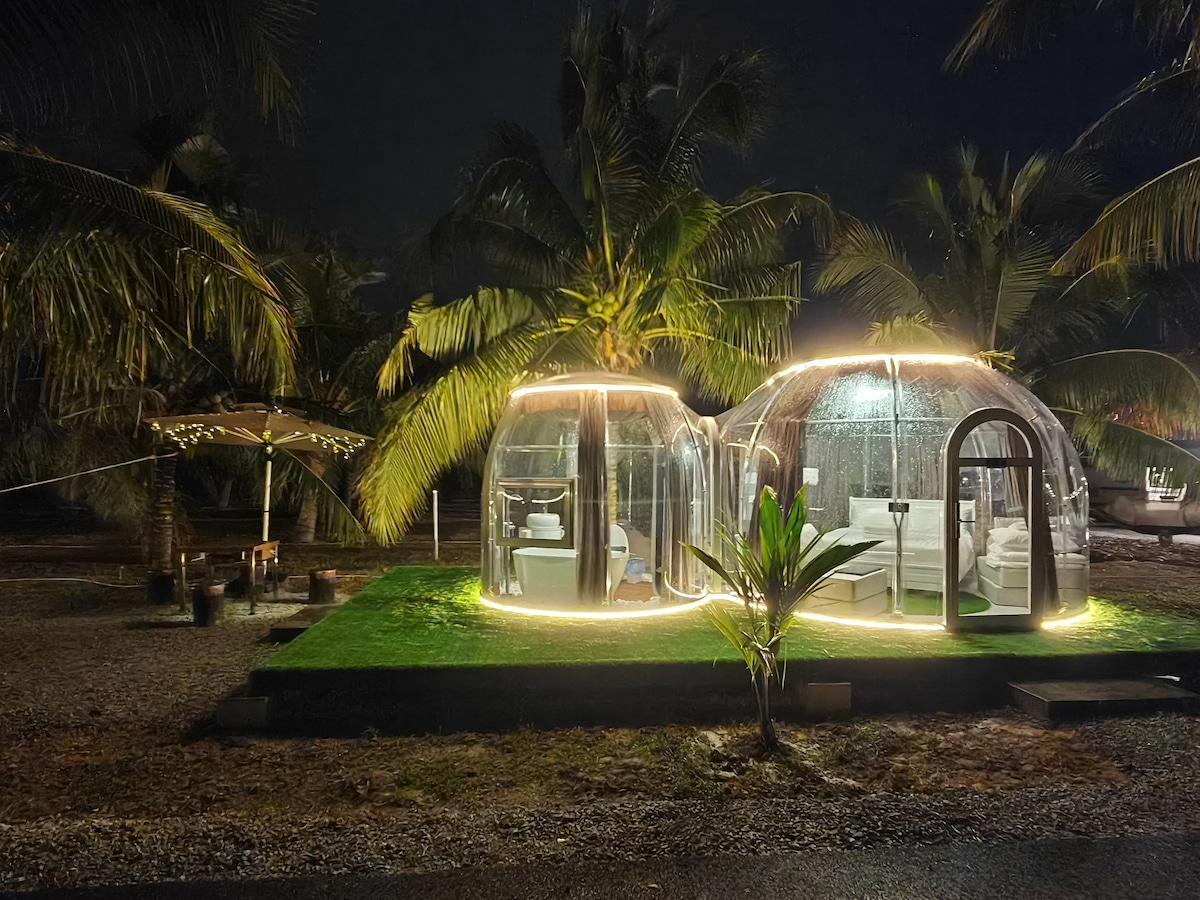 स्टारलक्स डोम अनुभव हमारे पारदर्शी स्टारलक्स डोम में ठहरने की अनोखी जगह का मज़ा लें, जो गेटेड ऐक्सेस और ब्लैकआउट पर्दे के साथ निजता की सुविधा देता है। गर्म पानी के बाथटब में आराम करते हुए साफ़ गुंबद के माध्यम से स्टारगेज़ करें। आपकी बुकिंग में एक बुफ़े डिनर और एक स्टीमबोट और ग्रिल मील शामिल हैं। लक्ज़री के स्पर्श के साथ रोमांटिक या आरामदायक विश्राम के लिए बिल्कुल सही। एक अविस्मरणीय ग्लैम्पिंग अनुभव के लिए अभी बुक करें!