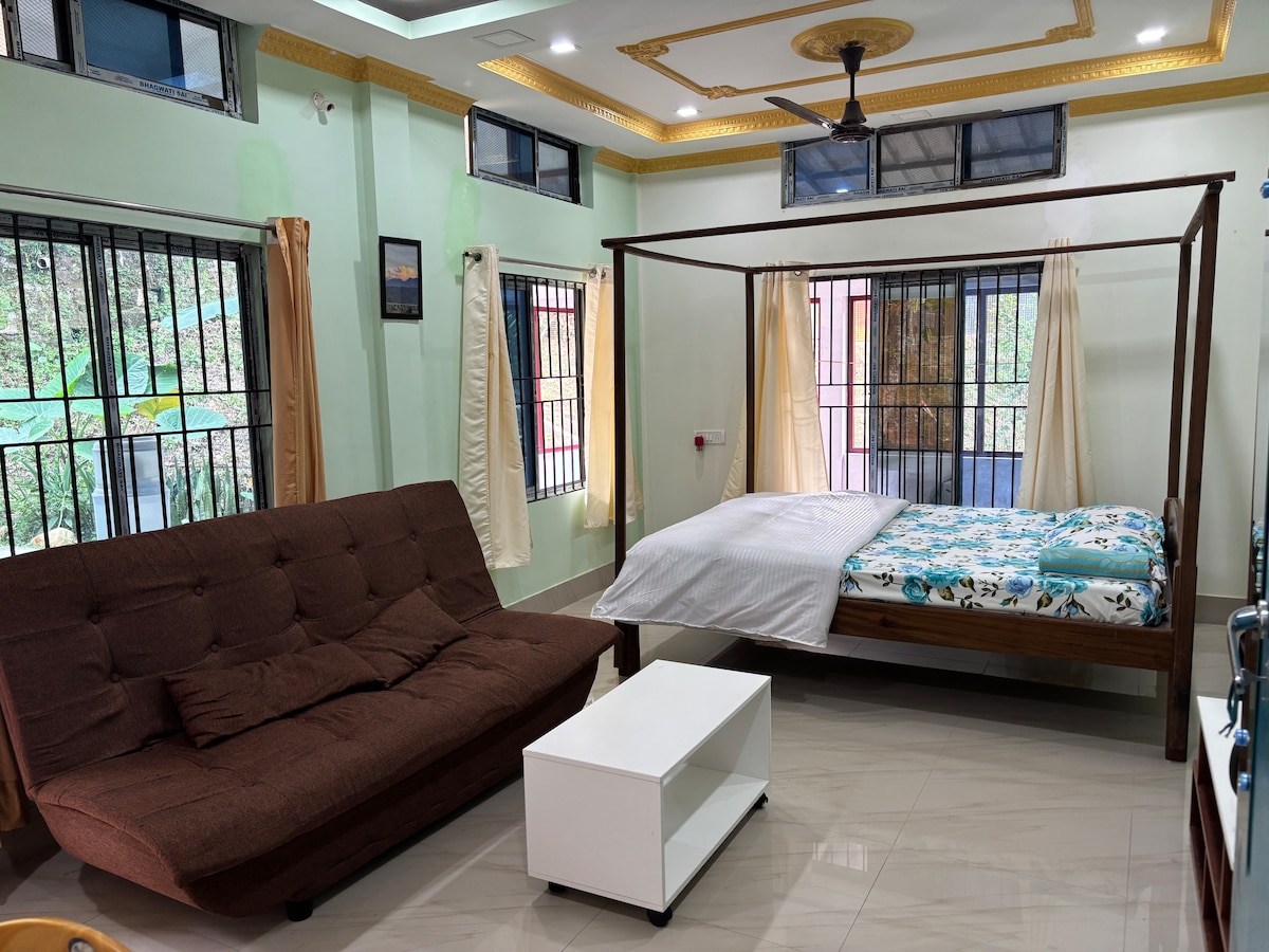 Welcome to Hagjer Homestay, a unique stone-and-red-roof property nestled amidst lush natural surroundings. This property offers a cozy, spacious room equipped with a sofa, dining table, and a clean, attached bathroom. Enjoy the semi-open terrace for dining or relaxing amidst the natural jungle views and fresh air. With a serene corridor entrance and ample, secure parking available, your stay here is designed for homely comfort and relaxation in a peaceful location of the town.
