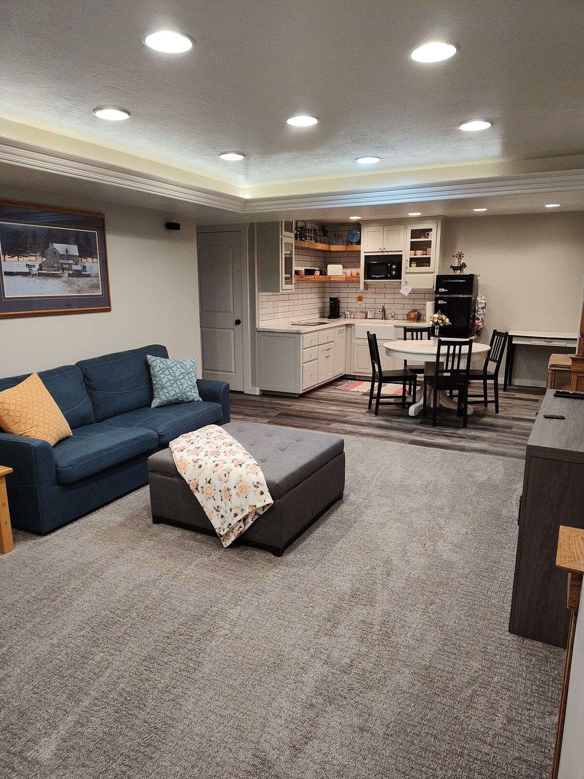 चारों ओर वक्ताओं के साथ एक 65" स्क्रीन पर फिल्मों का आनंद लें। रसोई में अपने अवकाश पर फ्रिज, माइक्रोवेव, टोस्टर ओवन और पैनकेक मिक्स - नाश्ता शामिल हैं! केवल सिंक के रूप में प्रदान किए गए पेपर उत्पाद बाथरूम में हैं। हमारे शेयर्ड जिम में वर्कआउट 2 बेडरूम - किंग और बंक (ट्विन, फ़ुल, ट्रंडल) और 1 बाथरूम मेहमान की पहुँच: आपको लगभग 20 सीढ़ियों पर और पीछे की ओर घूमना होगा। ध्यान देने योग्य बातें: यह जगह हमारे घर का बेसमेंट है, इसलिए आप हमें - फ़ैन और सफ़ेद शोरगुल सुन सकते हैं। सिर्फ़ 2 वाहन