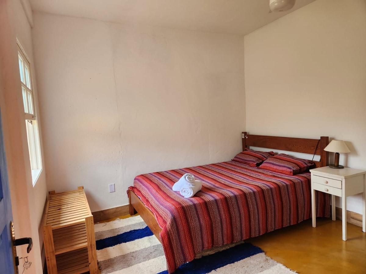 Suíte pequena e aconchegante (quarto com banheiro individual) com ar condicionado, cama de casal tamanho Queen, super confortável com muita privacidade. A suíte ainda tem uma cama de solteiro, se precisar de um espaço a mais para familiares .Lençóis de Percal 100% algodão, de pelo menos 200 fios, toalhas de banho. A suite está equipada com um frigobar. A rua é tranquila e permite estacionar com segurança.A casa possui apenas duas vagas de carro no estacionamento,o uso é por ordem de chegada.