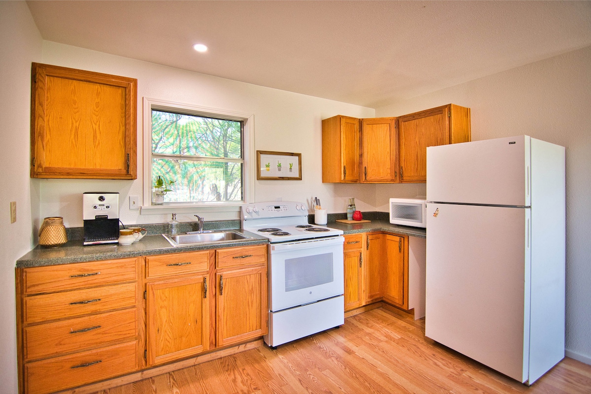पवन चक्की केबिन का आनंद लें, जो शांत, ग्रामीण जीवन के साथ अपडेट की गई शैली प्रदान करता है। यह 2 बेडरूम, 1 बाथरूम वाला घर एक परफ़ेक्ट ठिकाना है। कनेक्ट या अनप्लग रहने के लिए वाई - फ़ाई का इस्तेमाल करें और सुकून और सुकून का मज़ा लें। बड़ी स्क्रीन वाले टीवी पर डीवीडी या स्ट्रीमिंग सेवाएँ देखें या बाहर जाएँ और अद्भुत सूर्यास्त के साथ ‘वास्तव में बड़ी’ प्राकृतिक जगहों का आनंद लें। किचन में बर्तन, कुकवेयर और मसाले रखे हुए हैं। लॉन्ड्री रूम वॉशर/ड्रायर से लैस है और स्टोरेज की ज़रूरतों के लिहाज़ से काफ़ी बड़ा है।