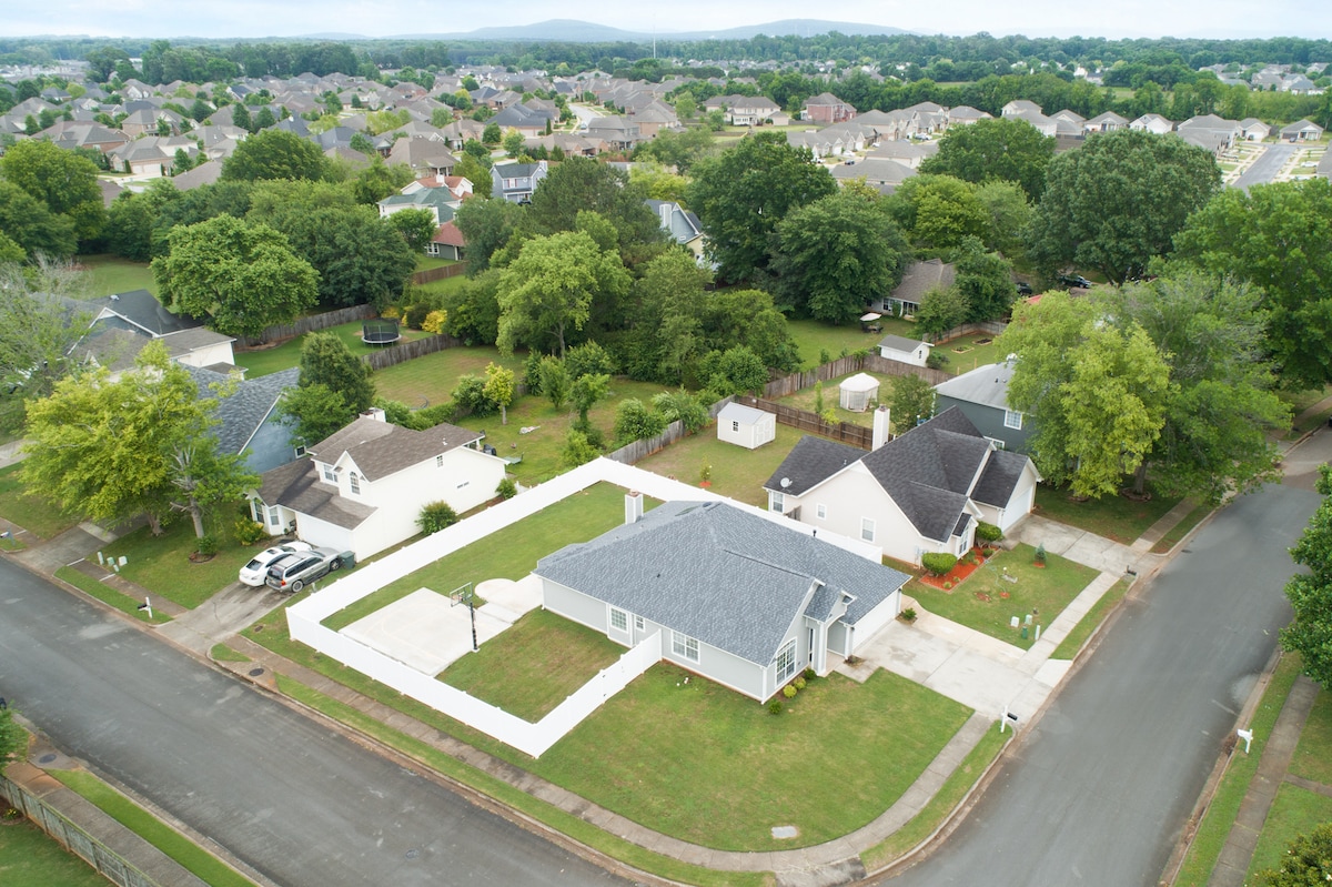 हवाई अड्डे, ट्रैश पांडा स्टेडियम और गेट 7 रेडस्टोन आर्सेनल के पास स्थित बड़े परिवार का घर। यह किफ़ायती और भरपूर जगह 9 तक सोती है! बेडरूम में किंग साइज़ बेड के साथ मास्टर बेडरूम सुइट है, बेडरूम 2 में एक डबल पुल आउट के साथ एक पूरा आकार का ट्रन्डल है, बेडरूम 3 में 2 डबल साइज़ बेड हैं। लिविंग रूम काउच में एक पुल आउट क्वीन बेड है। बाहर आपको एक बास्केटबॉल कोर्ट के साथ एक बड़ा कंक्रीट का आँगन मिलेगा। बच्चों के लिए पिछले आँगन में एक सुंदर अलाबामा दिवस का आनंद लेने के लिए बहुत सारी जगह।