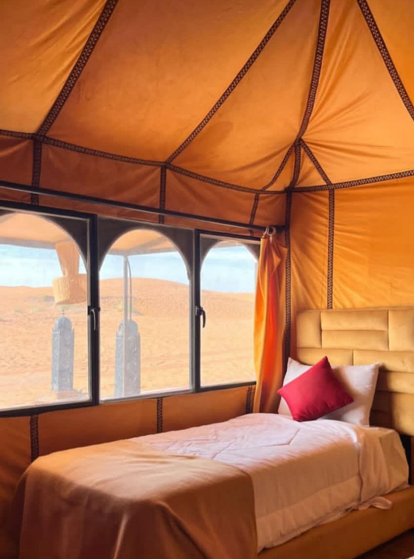 हमारा कैम्प, जो टीलों के बीच बसा हुआ है, में 10 विशाल टेंट हैं, जिनमें से प्रत्येक में शौचालय और एक निजी शॉवर है। प्रत्येक टेंट में अंदर और बाहर से एक व्यक्तिगत रूप से लॉक किया जा सकने वाला दरवाज़ा है, जिसमें हमारी सेवा द्वारा एक पैडलॉक मुफ़्त दिया गया है। इन 26 वर्गमीटर के टेंट के अंदर, आपको एक किंग साइज़ बेड और एक सिंगल बेड मिलेगा, जो तकिए, चादरें और तौलिए सहित अच्छी क्वालिटी के बेड से लैस होगा।