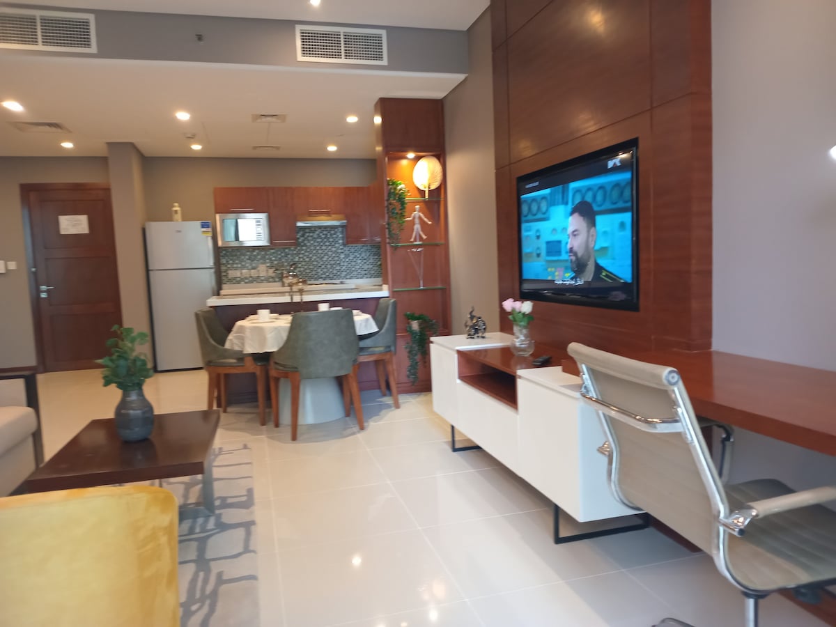 -About the space: A stylish, high-end apartment with a great city and sea view. It’s brand new with full amenities: fast Wi-Fi, private seating area, working space, 24/7 guest service, infinity pool, jacuzzi, jogging track, gym, squash court, BBQ area, cinema, business lounge, etc. Fully furnished for a comfortable, secure stay. Includes a fully equipped kitchen and private balcony with sea and sunrise views.