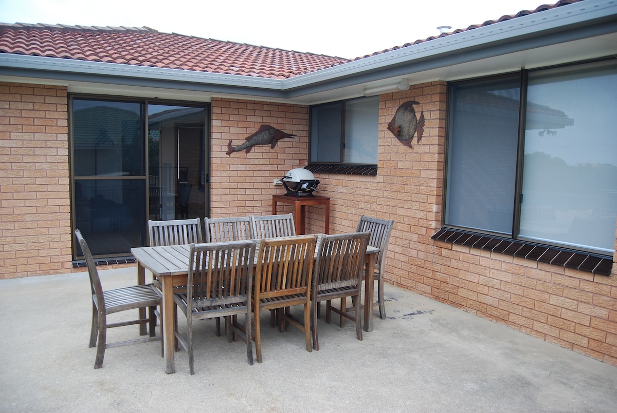 मोंटेग्यू द्वीप और वागोंगा इनलेट के फ़िरोज़ा पानी को देखने वाले समुद्र के दृश्यों के साथ प्रतिष्ठित ऑस्ट्रेलियाई समुद्र तट घर। पानी और शहर के लिए पैदल दूरी के भीतर एक आरामदायक छुट्टी के लिए एकदम सही जगह। एक किताब के साथ आउटडोर रहने, मनोरंजक या आराम का आनंद लें और दृश्यों और सूर्यास्त का आनंद लें। रियर डेक को सभी मौसम के विकल्प प्रदान करने के लिए कवर किया गया है। आवास आधुनिक सुविधाओं के साथ एक स्तर पर है, बड़े पूरी तरह से बाड़ वाले पिछवाड़े और नौकाओं के लिए स्तर पार्किंग के साथ पालतू जानवरों के अनुकूल है।