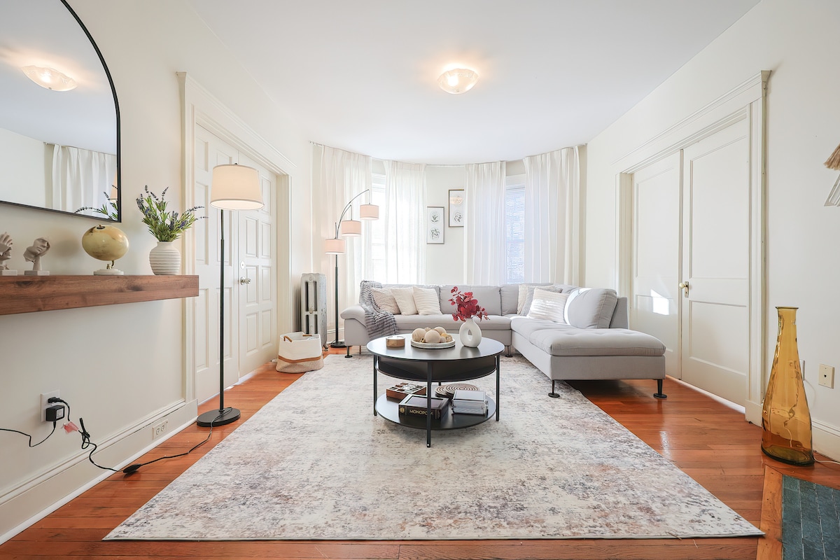 सुंदर बैठने की जगह के साथ बड़ा धूप वाला कमरा।