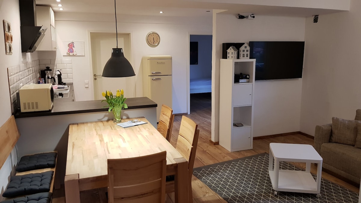 बेसमेंट में 40 वर्ग मीटर की रहने की जगह वाले हमारे अपार्टमेंट में आपको वह सब कुछ मिलेगा जो आपको चारों ओर अच्छा महसूस कराने के लिए आवश्यक है। लिविंग रूम और बाथरूम के आधुनिक, उच्च गुणवत्ता वाले सामान आपको आरामदायक वातावरण में आराम करने के लिए आमंत्रित करते हैं। आरामदायक भोजन क्षेत्र के साथ रसोई में आपको खाना पकाने और सुखद भोजन के लिए आवश्यक सब कुछ मिलेगा। आरामदायक लिविंग रूम में एक आरामदायक सोफा और टेलीविजन है। आधुनिक दिन की रोशनी वाला बाथरूम शौचालय और शॉवर से सुसज्जित है।