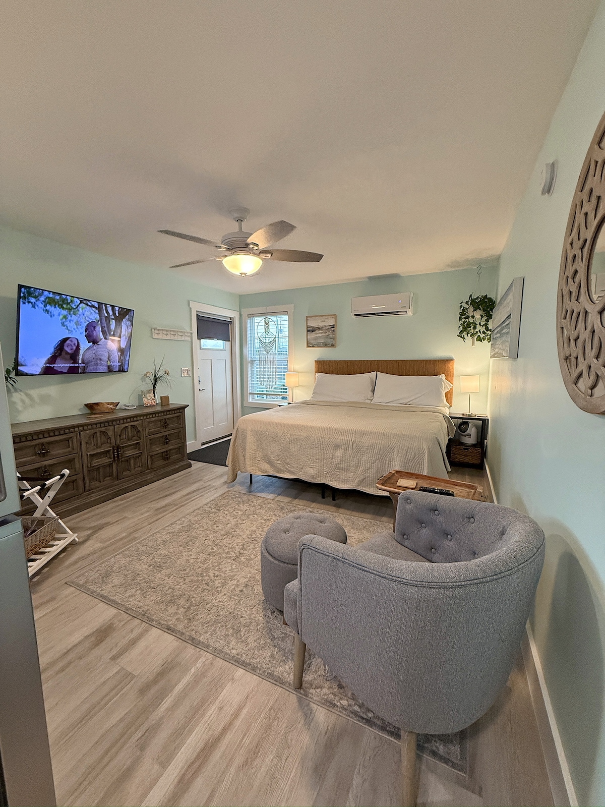 शिप्लैप दीवारों, व्हर्लपूल टब और बिडेट टॉयलेट के साथ रेनोवेट किया गया मास्टर बेडरूम सुइट। बहुत स्पा पसंद है और एकल या जोड़े के लिए एकदम सही है जो दूर जाना चाहते हैं। समुद्र तट के लिए आसान चलना।, किसान बाजार और आउटडोर संगीत कार्यक्रम । भोजनालयों के लिए पैदल दूरी आपके कमरे का दूसरी कहानी पर अपना प्रवेश द्वार है। पोर्च में बड़ी स्क्रीन भी आनंद लेने के लिए आपकी है! हमारे पास Roku TV है।