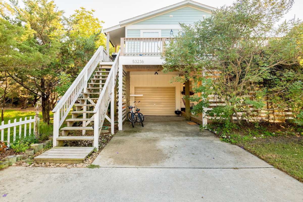 हमारा गेराज सुइट समुद्र तट और सर्फिंग थीम के साथ दो कमरे हैं। हमारे पास एक अलग गेराज है और सुइट पीछे है, अपने स्वयं के प्रवेश द्वार के साथ घर से अलग है। यहाँ एक क्वीन बेड, टिकी बार और किचन है। आप एक निजी डेक के चारों ओर बहुत सारे देवदार और बांस के साथ एकांत में होंगे। हमारी जगह ओक्रैकोक के दिल में है, जिसमें पैदल या बाइकिंग दूरी के भीतर रेस्तरां और दुकानें हैं। Ocracoke लाइटहाउस और स्प्रिंग पॉइंट नेचर प्रिजर्व 5 -8 मिनट की पैदल दूरी पर हैं।