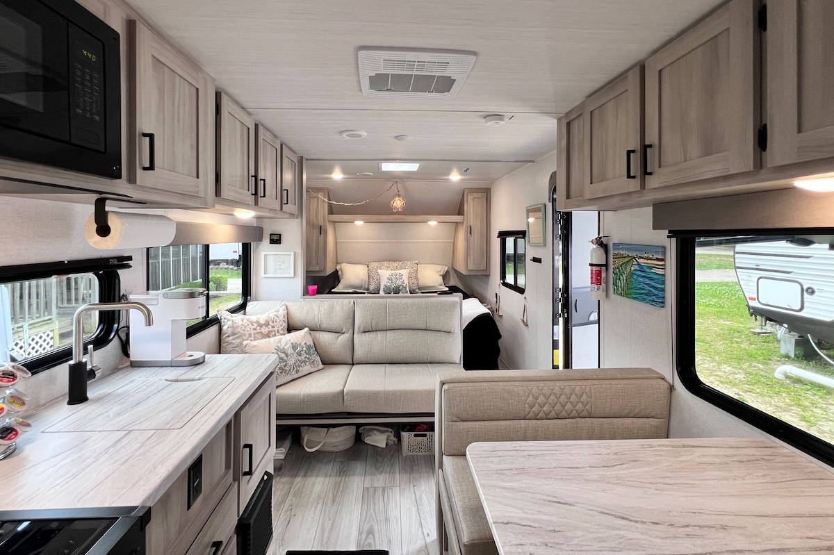 बड़े स्क्रीन वाले डेक के साथ अविश्वसनीय रूप से आरामदायक, विशाल कैम्पर। समुद्र तट या नमक पानी स्विमिंग पूल से 500 फीट। रोजर्स बे कैंप ग्राउंड में, इस रमणीय सेटिंग में यह सब है! समुद्र तट Bumz रेस्तरां के लिए टहलने, सचमुच कोने के चारों ओर 20 गज की दूरी पर या कयाकिंग, मछली पकड़ने या केकड़े के लिए कैम्पग्राउंड में वापस 20 गज की दूरी पर। एक कश्ती किराए पर लें, एक सर्फिंग सबक प्राप्त करें, या सड़क पर बस सर्फ सिटी जाएं और एक जेट स्की किराए पर लें। इस क्षेत्र में महान रेस्तरां भी हैं।