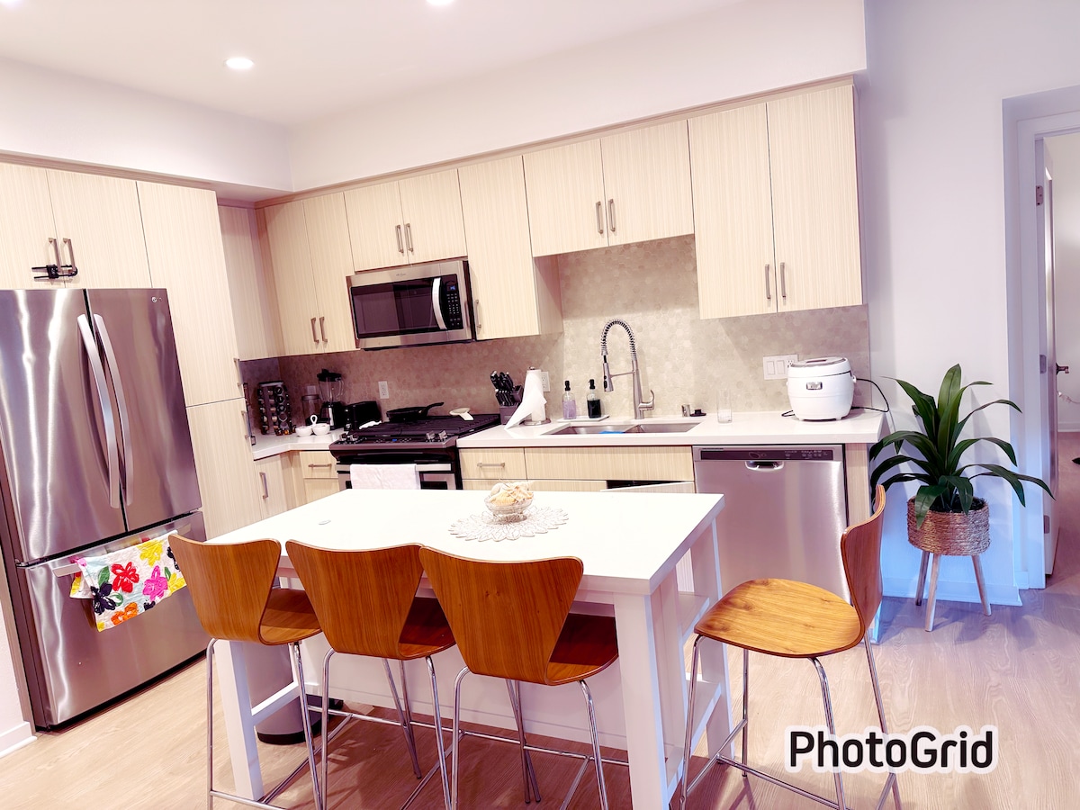 स्टाइलिश प्राइवेट अपार्टमेंट क्वीन बेड और आरामदायक एयर मैट्रेस और जीई डबल ओवन रेंज और 5 बर्नर कुकटॉप और बर्तन और पैन और डाइनिंग रूम टेबल, आरामदायक सोफ़ा और 54" टीवी के साथ पूर्ण रसोई के साथ 4 लोगों के परिवार के लिए एकदम सही है। आउटडोर कम्यूनिटी स्विमिंग पूल। हम हर बुकिंग के बाद खुद को बेदाग और संक्रमणरहित रखते हैं। परिसर में फ्रंट लोडर वॉशर और ड्रायर। डिनरवेयर और फ्लैटवेयर और कॉफी और चाय और बोतलबंद पानी। हर लिनेन और तौलिया हौसले को गैर - एलर्जेनिक डिटर्जेंट, बेकिंग सोडा और सिरका के साथ लॉन्डर किया जाता है