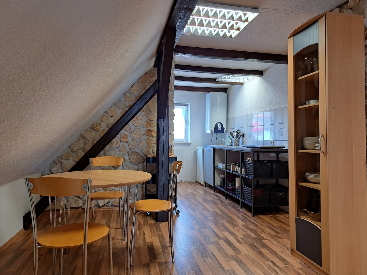 ऊपरी फ़्लोर पर मौजूद विशाल और आरामदायक 53 वर्ग मीटर का स्टूडियो अपार्टमेंट 5 लोगों के लिए पर्याप्त जगह देता है। सोने के अलग - अलग विकल्पों में 2 लोगों के लिए 1 किंग साइज़ का डबल बेड, 1 सिंगल बेड, 1 सोफ़ा बेड और 1 अच्छी क्वालिटी का फ़ोल्डिंग गेस्ट बेड शामिल है। छोटा रसोईघर छोटे भोजन तैयार करने के लिए उपयुक्त है। खाना पकाने के लिए, 2 हॉटप्लेट के साथ एक मोबाइल इंडक्शन हॉब और ग्रिल फ़ंक्शन के साथ 25 - लीटर माइक्रोवेव है। यह बगीचा मेहमानों के लिए उपलब्ध है।