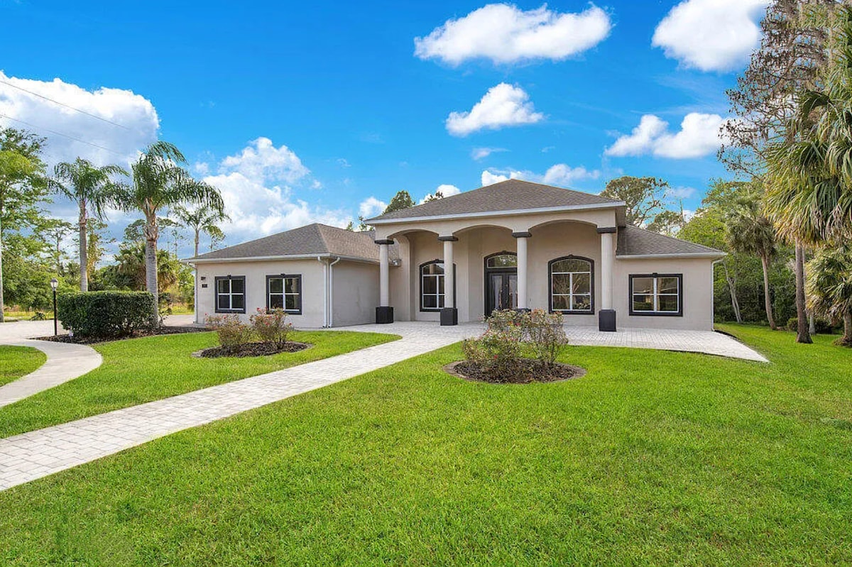 Welcome to your luxury FL Retreat 🌴, a beautifully designed 4BR 3BA spacious home. This spacious getaway offers the perfect blend of comfort, style and entertainment. ★★★Key features★★★ 🛏️ 4BR(5beds) 🌴 Screen-In Private Heated Pool 🔥 Fire pit & BBQ Grill 🍖 🚍 RV Parking (w/ RV & EV charging) 🛥️ Onsite Boat/Trailer Parking 🛁 Indoor Jacuzzi 💆🏻♀️ Massage Chair 🏋 Gym 🏓 Ping Pong 🚗 10min to Race Track, Pavilion & Beach Access 🅿️ Ample Parking 🌲 Scenic View 👨👩👦👦 Family-Oriented