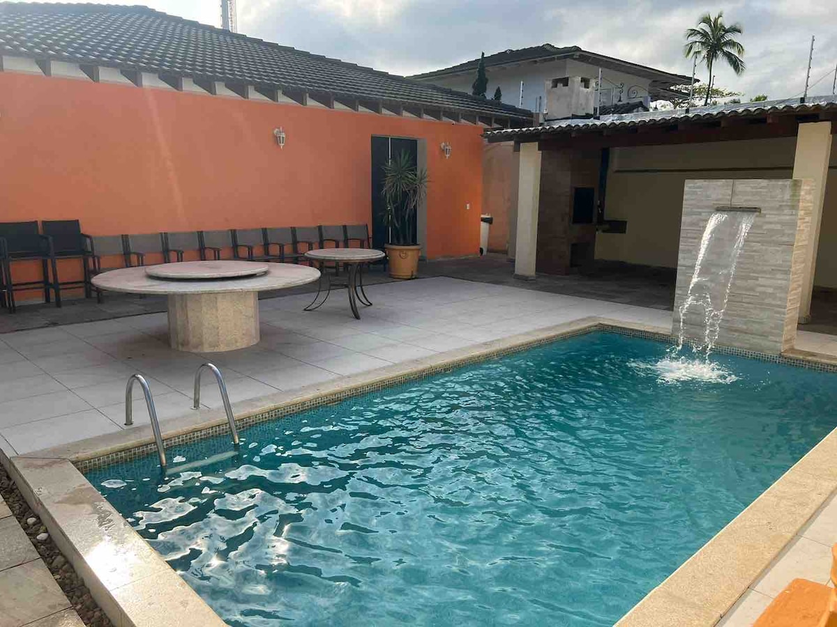Chamamos a nossa casa “Entre Águas e Montes: Refúgio Guarujá” pela sua localização e perfil gostoso para casais e famílias. A casa esta localizada em um condomínio fechado (“Condomínio Albamar”) ha uma curta distância do campo de futebol, quadra de tênis, parque e quadra de esportes mistos. A casa foi recentemente reformada e inclui uma piscina privada, churrasqueira, A/C (sala principal), ventiladores de teto em cada quarto e uma varanda acolhedora com rede e arranjos de estar.