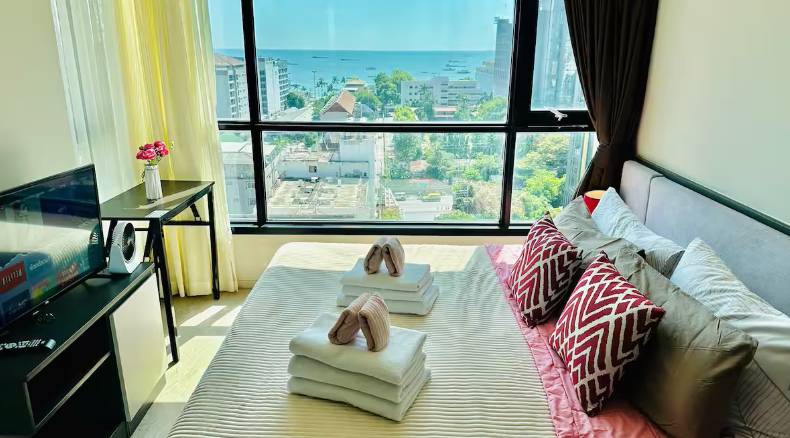 कमरा - 34 मंज़िल पर 36 वर्गमीटर का 1 बेडरूम 1 बाथरूम 1 डाइनिंग/लिविंग रूम। - 1 किंग साइज़ बेड (6 फ़ुट) 1 सोफ़ा बेड (5 फ़ुट) - हुड और इलेक्ट्रॉनिक कुकर के साथ बनाया गया किचन - 2 हवा की स्थिति, रेफ़्रिजरेटर, माइक्रोवेव, केतली सुविधाएँ - सीधे निजी बीच के सामने, स्विमिंग पूल - स्लाइडर के साथ पूल, फ़िटनेस - रूफ़ टॉप सी व्यू रेस्टोरेंट बहुत सुविधाजनक लोकेशन, स्थानीय खाना, सुविधाजनक स्टोर (7-11), लॉन्ड्री सेवा। टैक्सी, मनी एक्सचेंज, मसाज सभी सामने ही हैं