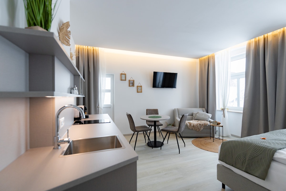हमारे पूरी तरह से नए जीर्णोद्धार किए गए अपार्टमेंट में एक लिविंग - बेडरूम है जिसमें एक आरामदायक डबल बेड और एक सोफ़ा बेड है, जो तीसरे व्यक्ति को समायोजित कर सकता है। बाथरूम आधुनिक रूप से डिज़ाइन किया गया है और एक वॉक - इन शॉवर और शेल्फ़ प्रदान करता है। एक बालकनी आराम करने और सुबह की कॉफ़ी का आनंद लेने के लिए जगह प्रदान करती है। पूरे घर में मुफ़्त टीवी और वाई - फ़ाई की सुविधा उपलब्ध है। हम ठीक बगल में एक मज़ेदार ब्रेकफ़ास्ट बुफ़े ऑफ़र कर सकते हैं। (साइट पर भुगतान)