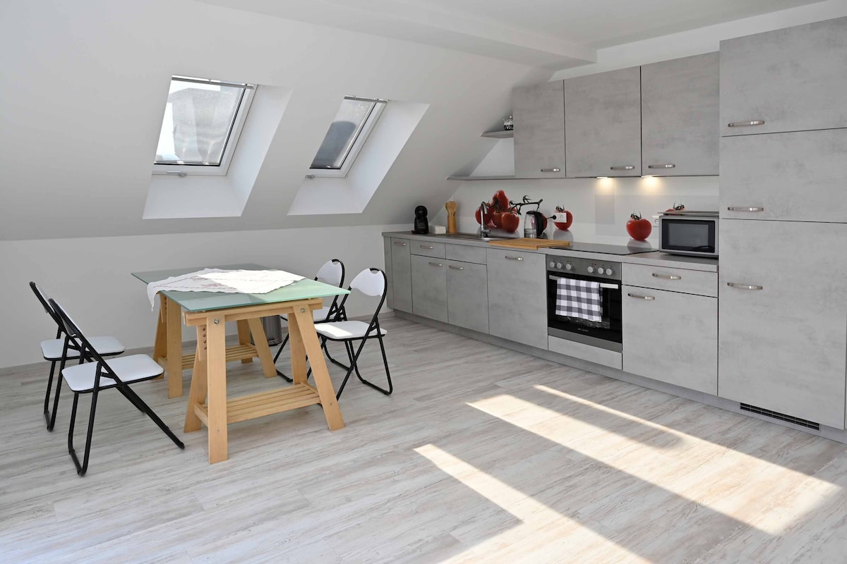 Diese besondere Unterkunft hat einen ganz eigenen Stil. Das Atelier besticht mit seiner großen Glasfront welche nach Süden sowie nach Westen ausgerichtet ist. Es gibt ein eigenes Bad mit Dusche und WC, eine Küche sowie einen privaten Parkplatz.