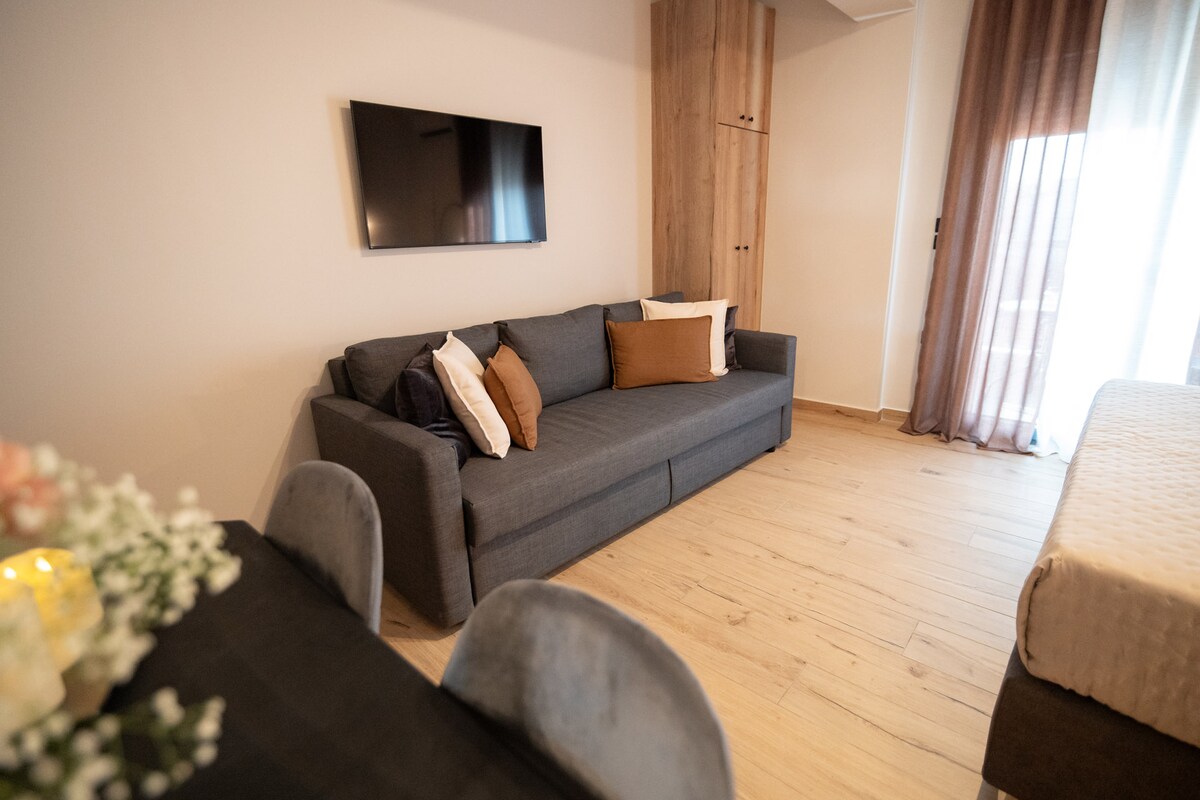 A studio apartment with a view of the Ionian Sea, just 2 km from the historic centre of Preveza. The apartment features a large double bed, a sofa bed (sleeping area 130*190 cm), and a fully equipped kitchen. The seaside area of Pantokratoras is one of the most beautiful neighborhoods in Preveza, with a lovely beach right below the apartment, as well as several others within less than 1 km. It can also be combined with the Ionian Blue Apartment.