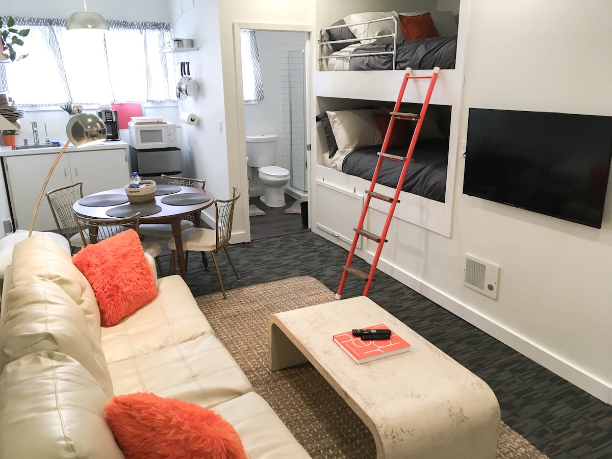 इस चमकीली और खुशनुमा जगह में पूरे आकार का किचन, एक डाइनिंग एरिया, लिविंग एरिया w/स्लीपर सोफ़ा और आधा बाथरूम शामिल है। लिविंग एरिया में यूनिट वॉशर और ड्रायर में समर्पित एक समर्पित वाईफ़ाई और स्मार्ट टीवी जो आपकी खुद की फ़ायरस्टिक के लिए तैयार है, या इसमें नेटफ़्लिक्स, डिज़्नी, अमेज़ॅन और यूट्यूब टीवी शामिल हैं। एक क्वीन बेड के साथ आकर्षक अलग बेडरूम, और एक निजी आँगन के स्लाइडिंग दरवाज़े के साथ पूरा बाथरूम, जो आपके सुबह या शाम के डाउनटाइम का इंतज़ार कर रहा है!