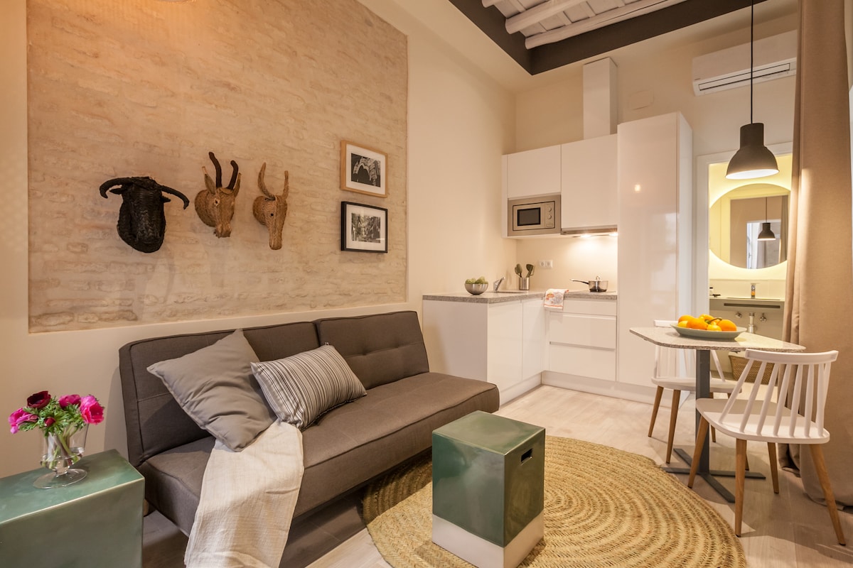 [Puerta CATEDRAL द्वारा MYLU सुइट] 2 वयस्कों + 18 वर्ष तक अधिकतम 2 वयस्कों + 1 बच्चे के साथ परिवारों के लिए एक बेडरूम का अपार्टमेंट आदर्श है। बेडरूम में निजी बाथरूम खुला है। सेविल के बीचों - बीच एक विशेषाधिकार प्राप्त वातावरण, प्यूर्टा कैटड्रल द्वारा हमारी बिल्डिंग MYLU सुइट में स्थित है। कैथेड्रल और रियल अल्काज़ार से कुछ मीटर की दूरी पर, जो शहर के दो सबसे ज़्यादा देखे जाने वाले स्मारक हैं। पूल वाली बिल्डिंग में कॉमन यूज़ टेरेस।