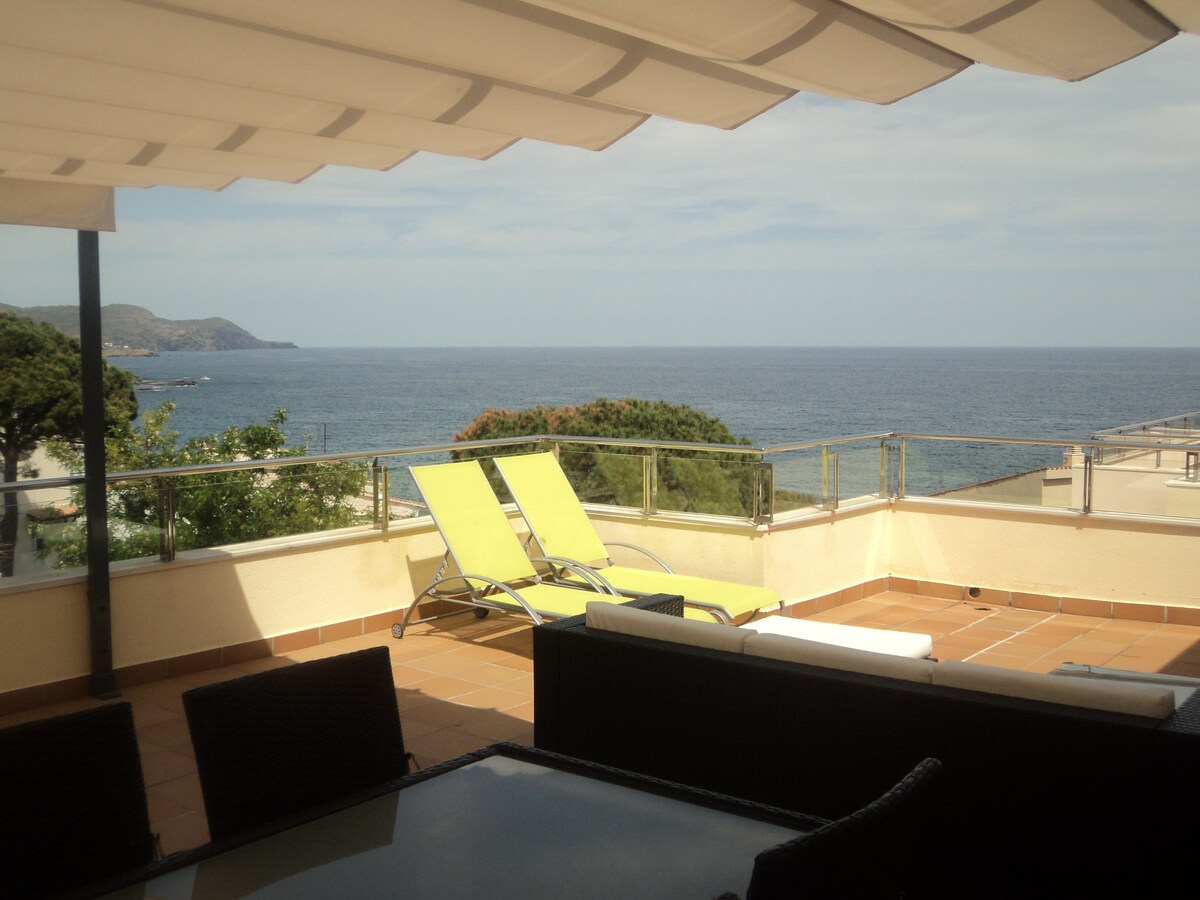 75m2 loft apartment with modern and unique architecture. Carefully designed, decorated with vintage-style furniture and art carefully selected over the years. This combination, along with a spectacular and impressive view over the bay of Cadaqués, makes it absolutely unique. It is located just 1 minute walk from Es Poal beach, about 45m away. PET friendly. We love animals. Please inquire privately about the extra cost per night for your adorable and furry friend.
