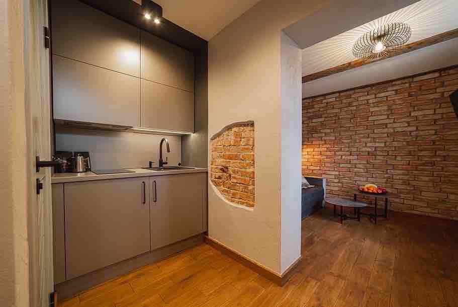 लकड़ी की इमारत में आकर्षक स्टूडियो अपार्टमेंट, 1856 में बनाया गया और एक बहुत पुराने शहर में स्थित है। 37 वर्गमीटर की इस जगह में 60 - टी की शैली की रसोई, क्वीन साइज़ बेड और एक बड़ा बाथरूम है। इस जगह को अलग - अलग दशकों के चुनिंदा फ़र्नीचर से सुसज्जित किया गया है।
