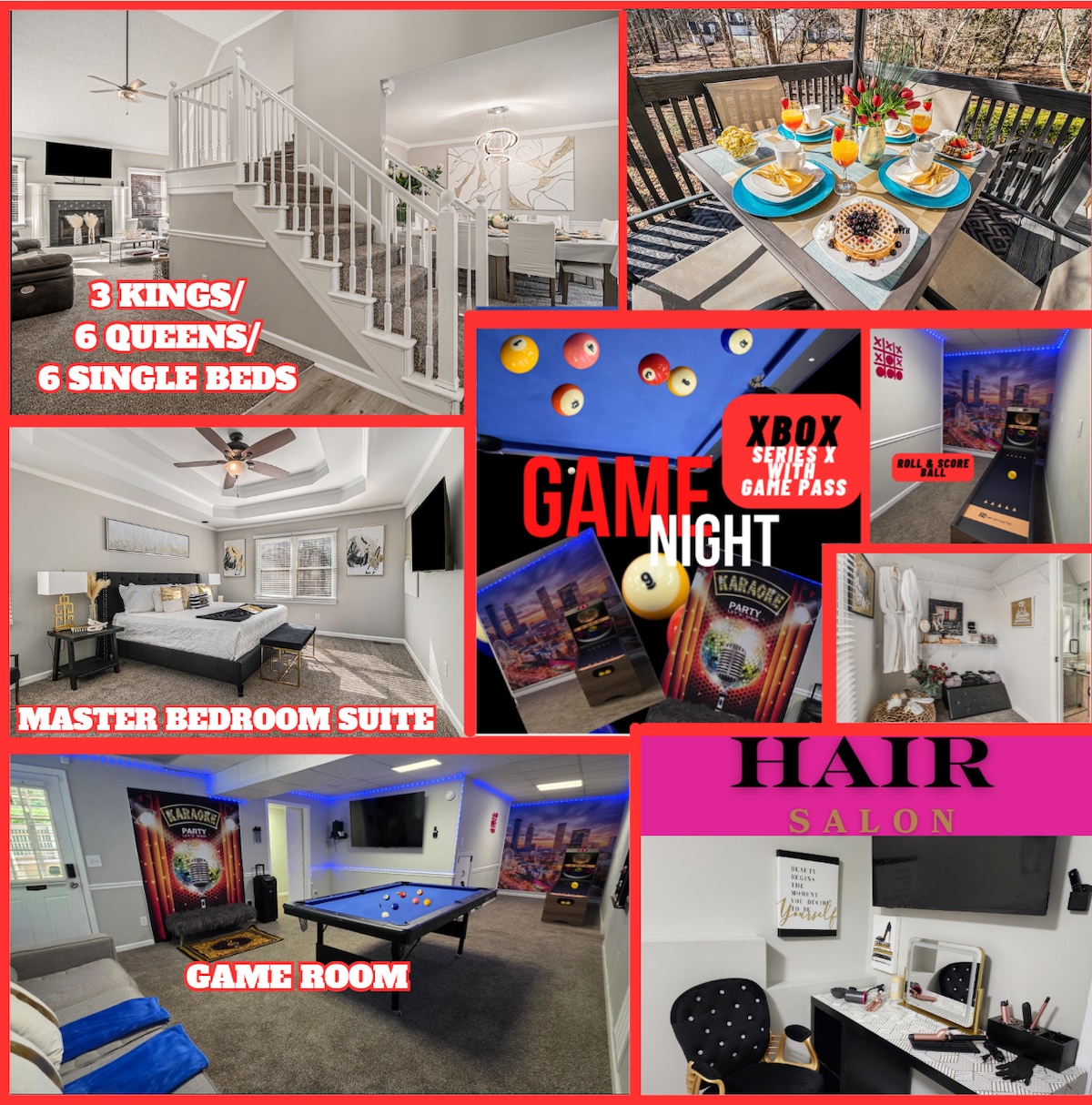 पूरे परिवार को साथ लाएँ, व्यावसायिक यात्रा करें, या कॉन्फ़रेंस करें @ इस शानदार जगह में मौज - मस्ती और मेलजोल के लिए बहुत जगह है। - EASILY में सोने के लिए 24 मेहमान ठहर सकते हैं: 3 किंग/5 क्वीन/4 ट्विन/ 2 ट्विन XL बेड/ क्वीन एयर मैट्रेस -9 बेडरूम, लक्ज़री 3 - मंज़िला घर: शांत परिवार के आस - पड़ोस में 4,500 वर्ग फ़ुट का घर - हर बेडरूम, फ़ैमिली रूम और गेम रूम में बड़े 4k टीवी *हेयर सैलून *कराओके *पूल टेबल *रोल और स्कोर बॉल *PATIO DECK - MAIN और निचला स्तर
