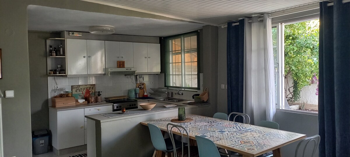 मरीना में बोट के साथ समुद्र के ठीक सामने सलामिना में एक छोटा - सा पारंपरिक घर। बंदरगाह और पैगंबर एलियास की पहाड़ी के सामने फूलों से भरा एक बड़ा सुंदर आँगन है। कई दुकानों, सुपरमार्केट मछली रेस्तरां, रेस्तरां, कैफ़े और बार के साथ शहर के बगल में। 2 -3 लोगों के लिए आदर्श।