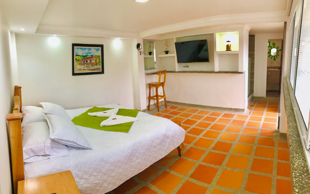 Habitación doble con lugar para trabajar y baño privado en el Hotel Salento Green House. Estamos ubicados a 3 cuadras del parque principal. Recepción 24/7, wifi gratis, aseo disponible en la estadía, Smart TV de última generación, Alexa, opciones de transporte, tour desk y almacenamiento de equipaje. Nuestra ubicación estratégica te conecta con los mejores paisajes, cafés y atractivos de Salento, combinando confort, estilo y exclusividad en cada momento.