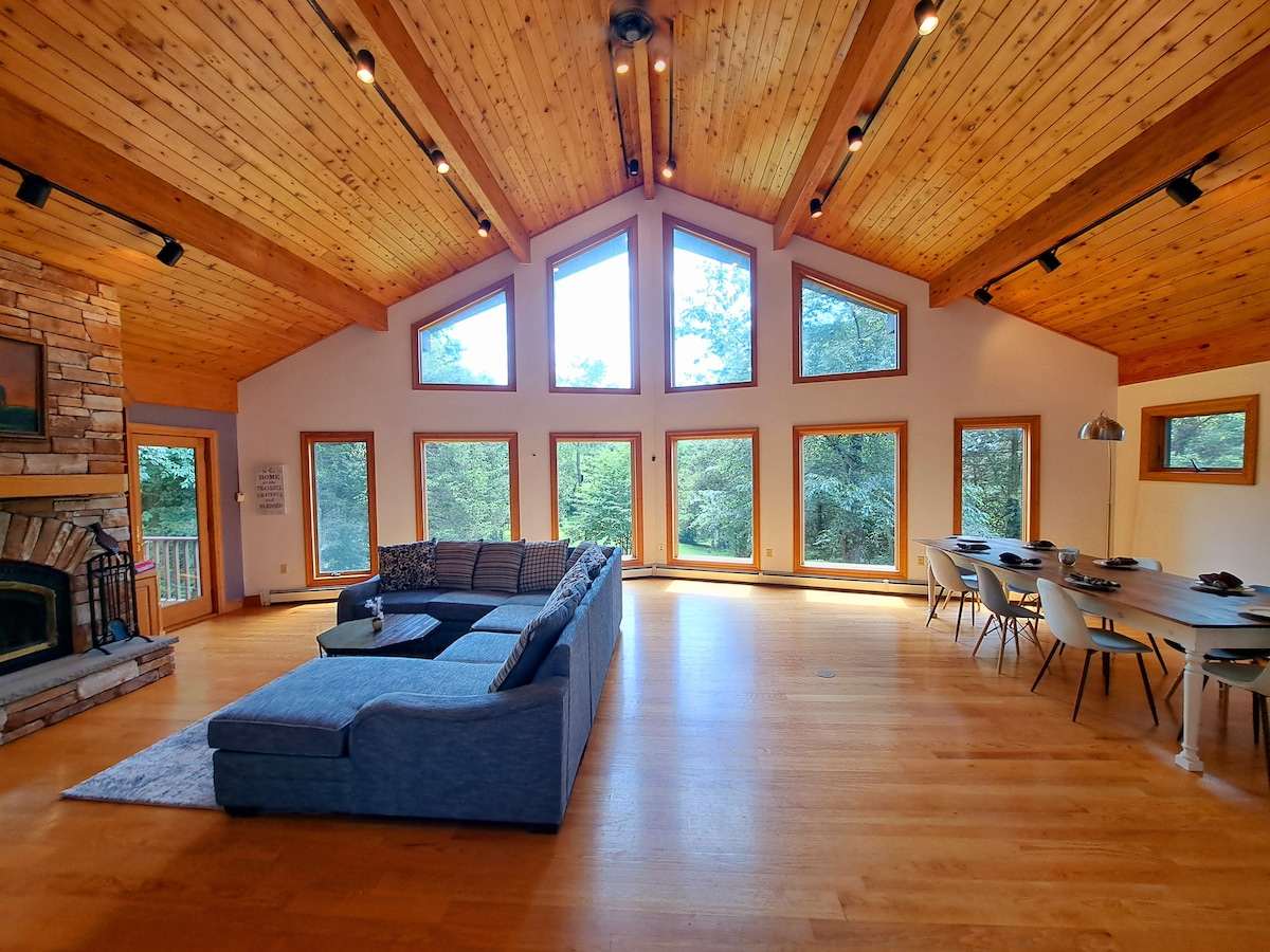 यह डिज़ाइनर केबिन प्राकृतिक सामग्री और आधुनिक फ़िनिश को मिलाता है। — परिष्कृत और आरामदायक। घर से वसंत के पानी से भरे तालाब की शानदार सीढ़ियों पर नज़र डालें (या तैरें!)। डेक पर लाउंज लगाएँ या सनरूम में कॉफ़ी का मज़ा लें। अंदरूनी हिस्सों में तीन बेडरूम, दो पूरे बाथरूम, ठाठ और आरामदायक फ़र्नीचर वाला लिविंग रूम और लकड़ी जलाने वाली फ़ायरप्लेस और पूरी तरह से नियुक्त किचन है, जो खाना पकाने के लिए खुशी की बात है। 10 के लिए टेबल पर अपने परिवार और दोस्तों का मनोरंजन करें और मैदान तक जारी रखें, हाथ में पेय।