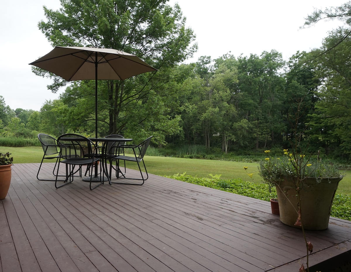 शांतिपूर्ण जंगल में एक आरामदायक स्टूडियो में आराम करें। ज़ायकेदार क्वालिटी के स्पर्श से आप तुरंत सहज महसूस करेंगे! यह अधिकतम 2 वयस्कों और अधिकतम 2 बच्चों के लिए एक आदर्श जगह है। हम ऊपर की मंज़िल पर रहते हैं और खुद से चेक इन करने की सुविधा देते हैं हडसन घाटी में एक दुर्लभ खोज, हमारा पड़ोस ज्यादातर सपाट है, जिसमें पैदल चलने योग्य, शांत सड़कें और उत्कृष्ट पक्षी देखने हैं। यह विशाल राज्य - व्यापी रेल ट्रेल सिस्टम और मोहोंक प्रिजर्व द्वारा ऑफ़र की जाने वाली सभी चीज़ों से जुड़ने के लिए एक आसान बाइक की सवारी है।