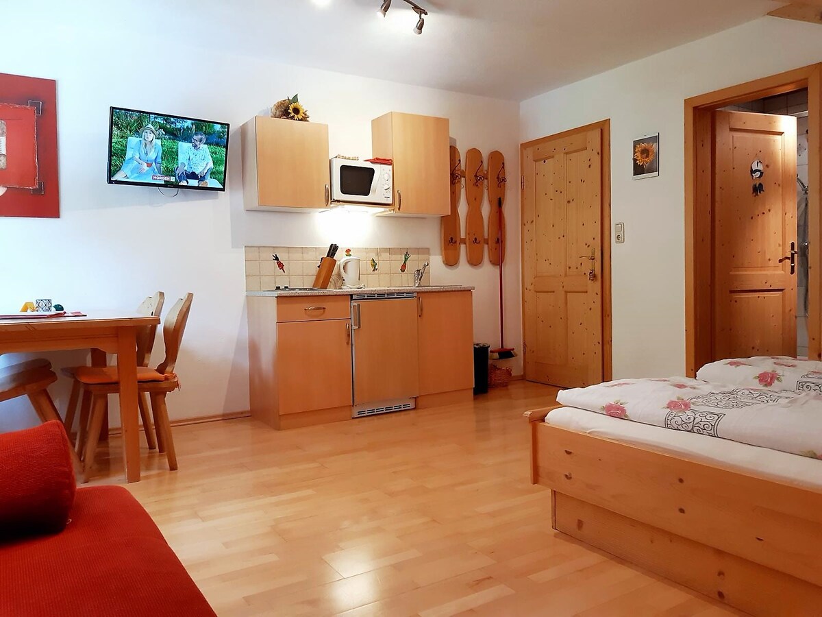 कोने में सीट और सोफ़े, सैटेलाइट टीवी और रेडियो, बेडरूम, शॉवर/वॉशरूम (अलग) और इन्फ़्रारेड क्यूबिकल के साथ बड़े किचन/लिविंग रूम वाला आरामदायक हॉलिडे अपार्टमेंट। बालकनी पर आप सुबह की धूप का आनंद ले सकते हैं और घास के मैदान से बहती धारा की छल-छल की आवाज़ सुनते हुए आराम कर सकते हैं।