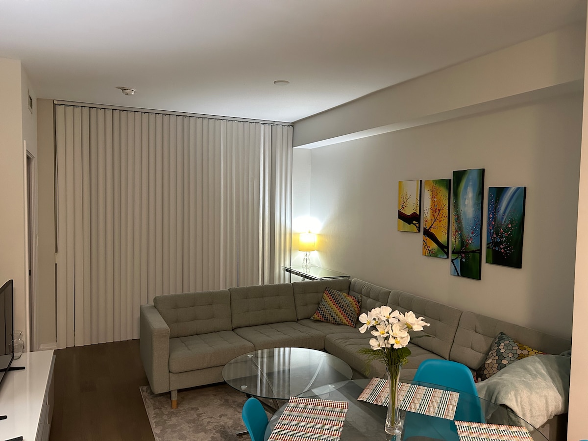 Brand new 1 Bedroom + Den fully furnished executive private condo in the heart of downtown Toronto with private CN Tower & Lake Ontario view. Perfect for business trips, couples & solo travelers. Complimentary: Free welcome bottle of wine. Free Coffee & Tea High speed internet - 1 Gbps fibre. Full kitchen Ensuite washer & dryer with all soaps & detergents. 2 minute walk to: Scotiabank Arena Union Station Rogers Center CN Tower Ripley's Aquarium Waterfront King St. West Financial District