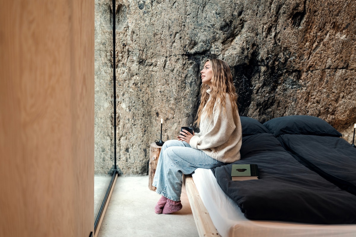 A romantic and exclusive retreat with breathtaking views over the sea and mountain Hornelen. The spectacular bedroom in the woods is an architectural masterpiece by it's windows merged into a giant rock. In a warm cozy bed you'll hear the forests’ sounds while touching geology, have cool Scandinavian design around you and maybe see the Northern lights or stars above you. The private, stylish and well-equipped apartment has all the comfort you ask for. This is what we call a getaway of a lifetime