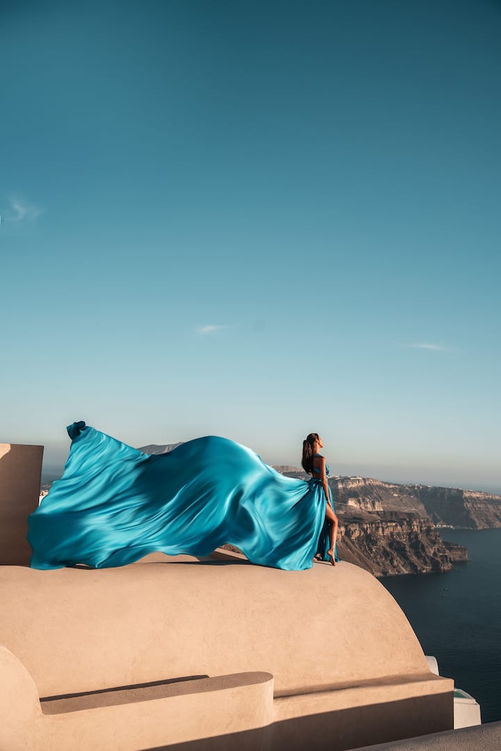 मैं सैंटोरिनी में रचनात्मक और नेत्रहीन फ़्लाइंग ड्रेस फ़ोटो प्रदान करता हूँ।