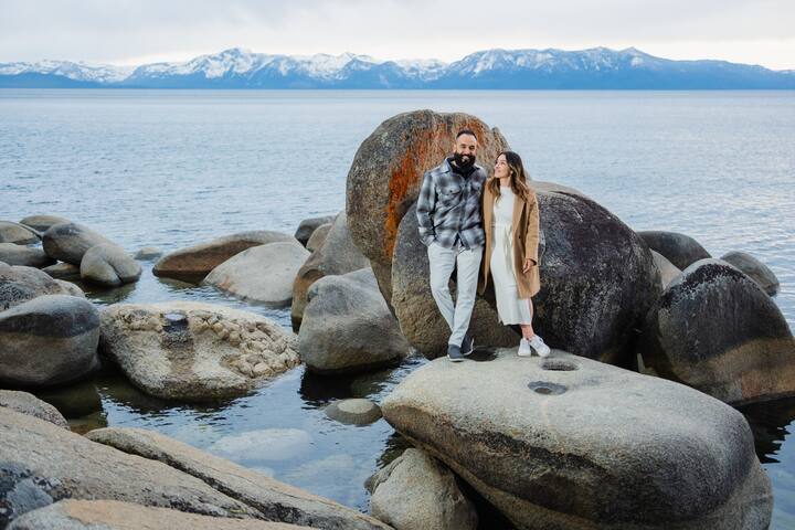 लेक ताहो की लुभावनी सुंदरता में रोमांटिक सगाई सत्र के साथ अपने प्यार का जश्न मनाएँ।