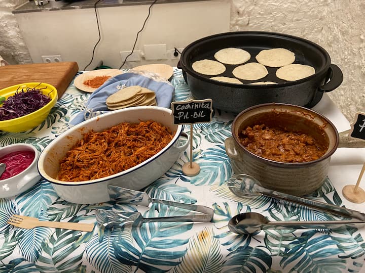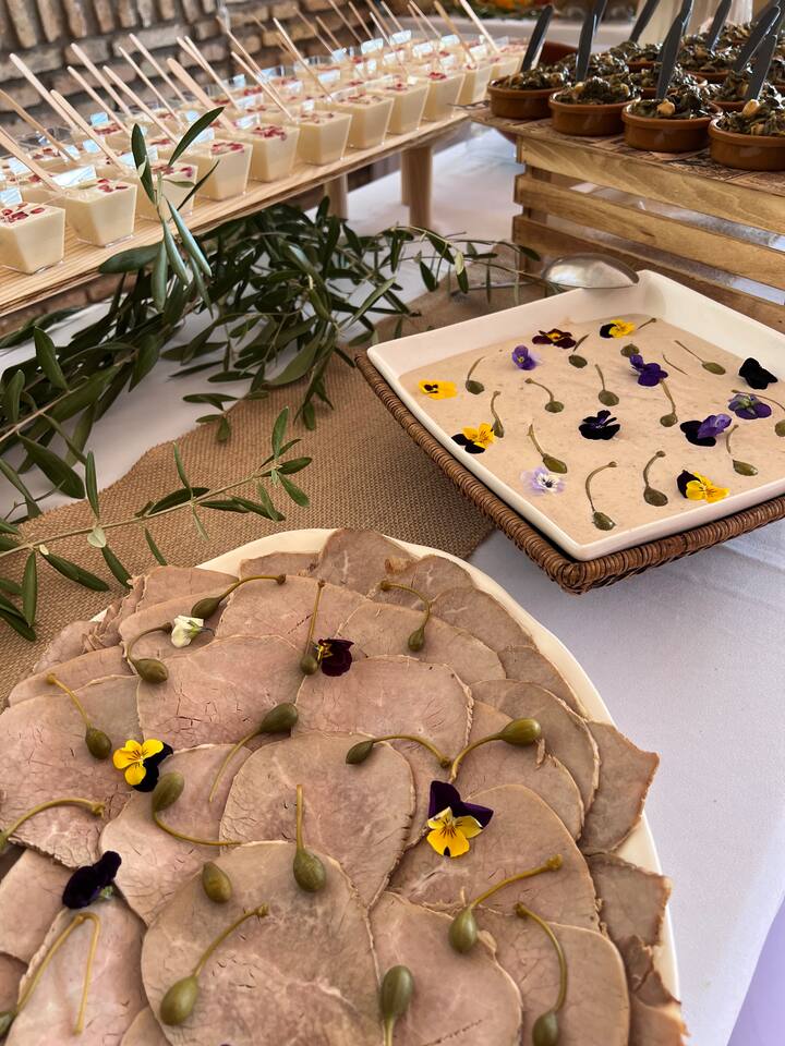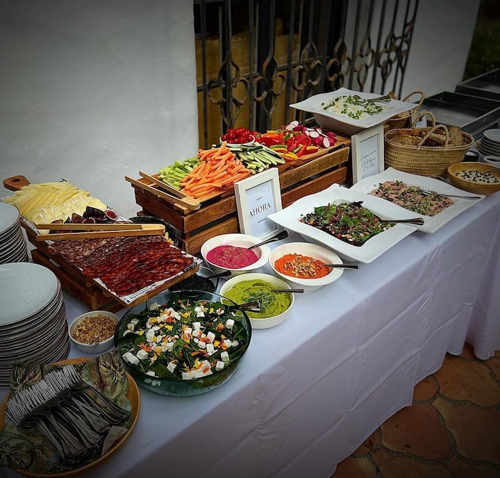 स्पैनिश और अंतरराष्ट्रीय व्यंजनों की बुफ़े टेबल, जिसमें 10 व्यंजन शामिल हैं, जिन्हें हम एक विस्तृत श्रृंखला में से चुन सकते हैं, जिसे हम सीधे ग्राहक को भेजते हैं।