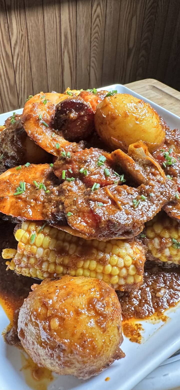 एक रेस्तरां - शैली के समुद्री भोजन पर केकड़ा, झींगा, एंडोइल सॉसेज, लाल आलू, स्वीटकॉर्न और उबले हुए अंडे के साथ उबालें, एक मसालेदार कैजुन बटर सॉस के साथ जोड़ा गया है।